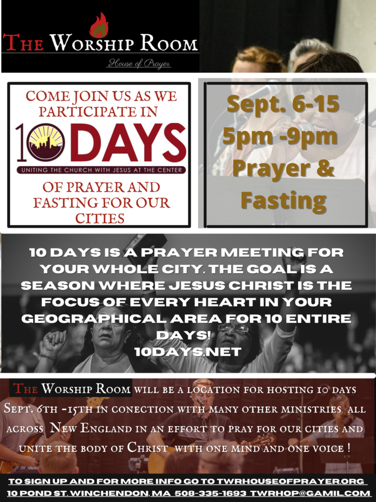 We want to let you know about a special event that is coming up Sept 6th – 15th called, 10Days. This is something that is happening all across New England with many other churches and ministries. The Lord is inviting His Church to slow down and focus on Him by praying and fasting. 10days is a prayer meeting for your whole city. The goal is to have a season where Jesus Christ is the focus of every heart in your geographical area for the entire 10 days. Jonathan Friz, a local missionary, has been organizing this event every year since 2004. Jonathan has carried this vision in his heart to see cities crying out to God for the Lords will to be done on earth as it is in heaven. Jonathan also has a desire to see the the body of Christ come together in a unique way of prayer, fasting, and repentance. When the Body of Christ comes together in unity the Holy Spirit will do more. Psalms 133 tell us that when brethren dwell together that God will command a blessing. What if that blessing is the gospel going forth in great power, or healing being released in signs and wonders? What if that blessing is a whole city getting saved? That’s why we want to invite you to be apart of these 10 days with us. Whether you’re an individual or a local church we desire to do this together! During these 10 days The Worship Room will be open every night from 5pm – 9pm with live worship and prayer. If you are a worship leader, or a musician that can lead worship we want to invite you to sign up and help us fill every hour of this schedule with live worship. We are also looking those of you who love to pray or who want to help strengthen the room with prayer to sign up as well. It would be great to have at least 3 or 4 people in the room during each hour of this schedule!